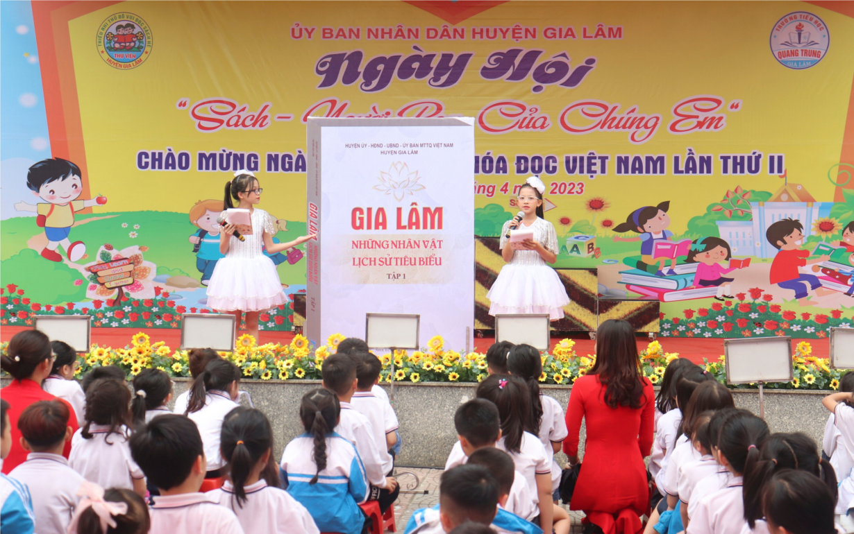 Trong khuôn khổ của Ngày hội đọc sách, các vị đại biểu Huyện và cơ sở cùng toàn bộ các thầy cô giáo, các em học sinh của Trường tiểu học Quang Trung đã hào hứng tham gia. Đây là một trong những hoạt động quan trọng và ý nghĩa đối với huyện Gia Lâm. Đồng thời, cũng dịp để các thầy cô, các em học sinh cùng nhau kết nối và bằng những hành động thiết thực, ý nghĩa nhất tôn vinh giá trị của sách. Khẳng định vị trí, vai trò và tầm quan trọng của sách “Gia Lâm những nhân vật lịch sử tiêu biểu”, tôn vinh người đọc và những người tham gia sưu tầm, sáng tác, xuất bản, in, phát hành, lưu giữ sách.