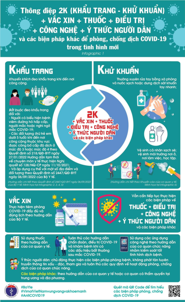 Trong thông điệp phòng chống dịch COVID-19 mới nhất của Bộ Y tế, thông điệp 5K giảm còn 2K + gồm: khẩu trang, khử khuẩn; Cùng đó, Bộ Y tế kêu gọi người dân tiêm vaccine đầy đủ, đúng lịch, kết hợp "thuốc + điều trị + công nghệ + ý thức người dân